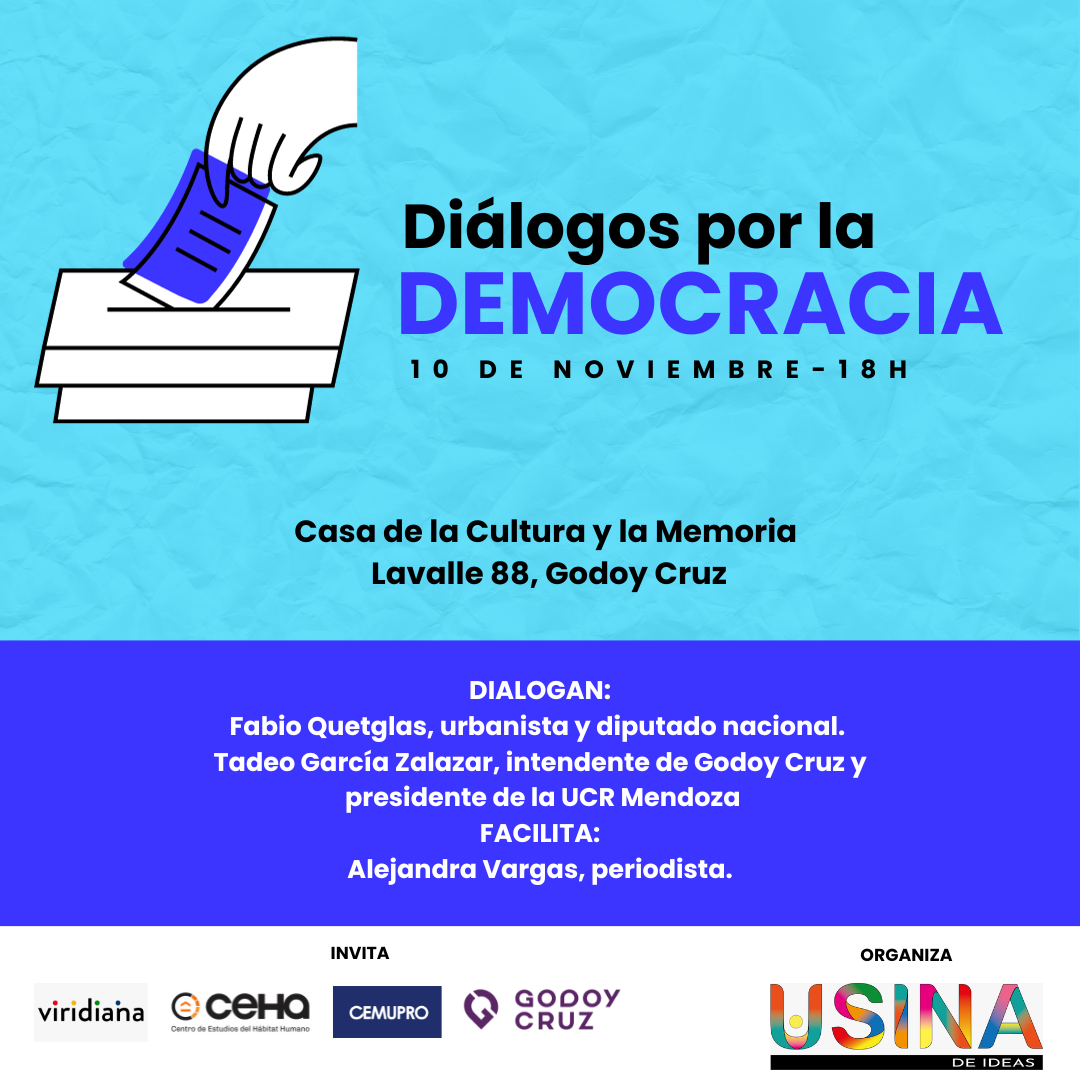 Los Diálogos por la Democracia  son una iniciativa de Usina de las Ideas, por los 40 años de democracia en la Argentina. Acompañan: Viridiana, Centro de Estudios del Habitat Humano de la Universidad Nacional de Cuyo (CEHA), el Centro de Estudios Municipales y Provinciales (CEMUPRO) y la Municipalidad de Godoy Cruz.