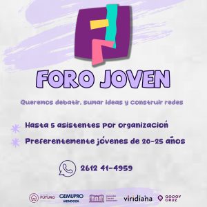 Más sobre el Foro JovenParticiparán del Foro Joven diversas asociaciones civiles, emprendimientos y organismos de la provincia. No solamente habrá intercambio de visiones y experiencias, sino que contará con un espacio de asesoramiento de la Municipalidad de Godoy Cruz. Participan en la organización Viridiana y Cemupro Mendoza.